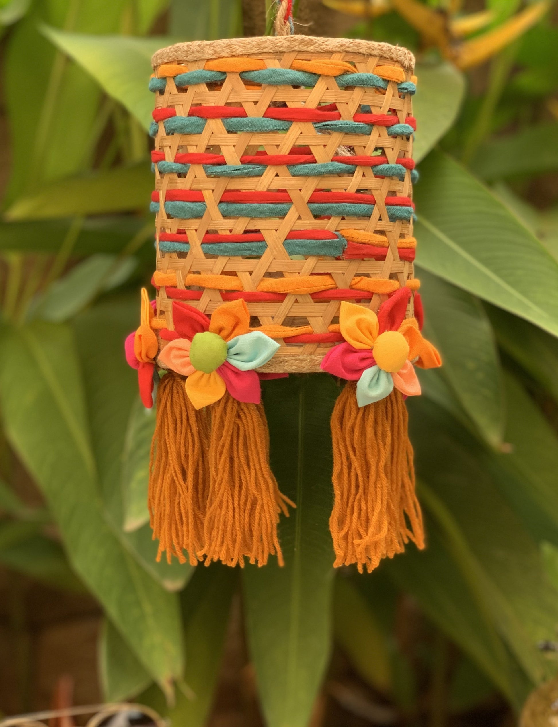 This super fun, playful and superbly crafted cyclinder lampshade casts decorative colourful patterns in a room lending a warm and welcoming glow to your home. Adorned with uniquely handcrafted multi colour flowers complements the cane structure woven with vibrant fabric.