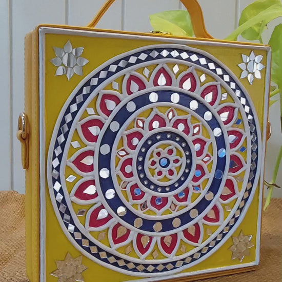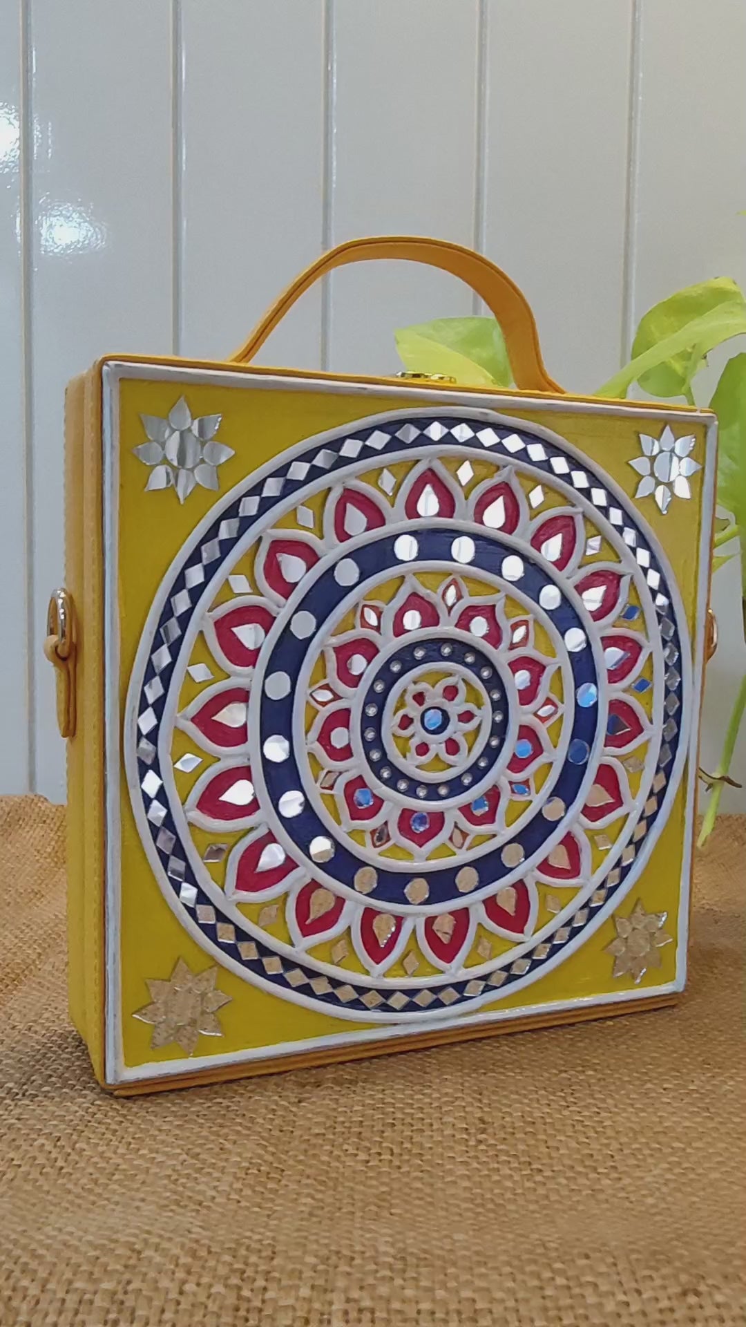 Behold the captivating beauty of an exquisitely intricate Concentric circles adorning the front of our Handcrafted Lippan Art Square Bag. Discover our exquisite collection of handcrafted Lippan Art bags created by talented local artisans. Each bag is a unique masterpiece, meticulously crafted with love and care, showcasing the rich cultural heritage of the region. The bags feature intricate Lippan Art patterns, adorned with vibrant colors and traditional motifs, representing a harmonious blend of tradition and contemporary style.