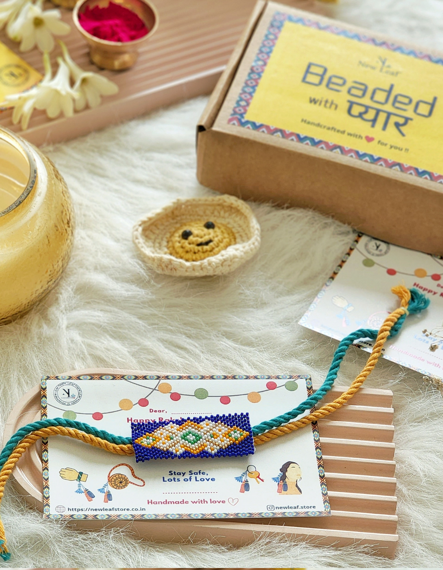 New Leaf brings to you India's 100% handmade multi function accessory by local artisans- 'Beaded with Pyaar' The customized rakhi! This rakhi is a unique blend of Gujrat beadwork and Rajasthan tassels designed both for men and women. With every thread of rakhi beaded with love, let's celebrate Raksha Bandhan this year with style and uniqueness!