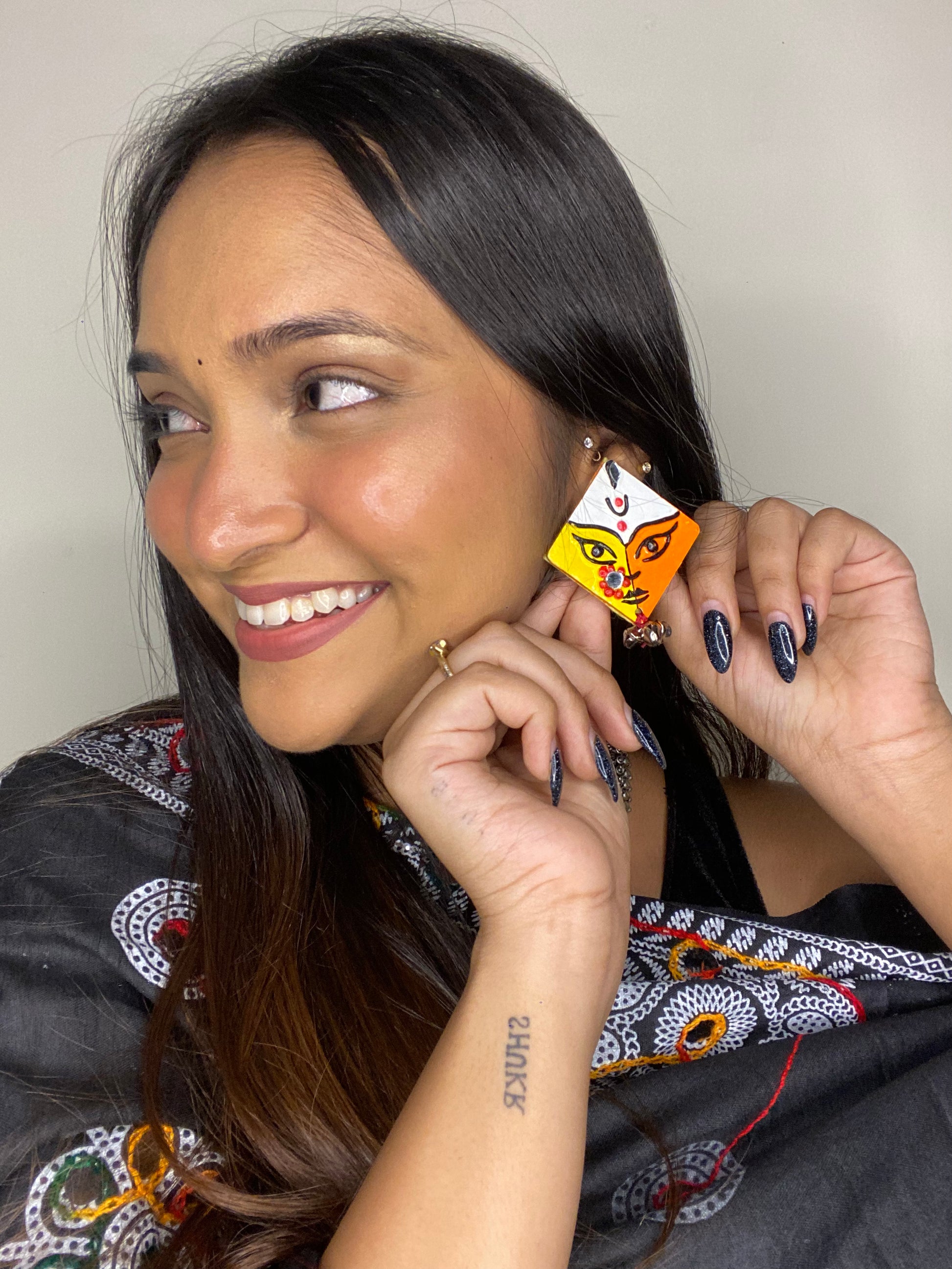 Elevate your accessory game with our Durga Ji Lippan Art Handmade Earrings. Each pair features a stunning blend of traditional Lippan art and modern design, incorporating the protective charm of the evil eye symbol. Handcrafted with precision, these earrings are adorned with vibrant colors and intricate patterns that catch the eye. Perfect for any occasion, they offer both style and spiritual protection. Discover the unique fusion of art and function—shop now to own a pair of these distinctive and meaningful earrings.